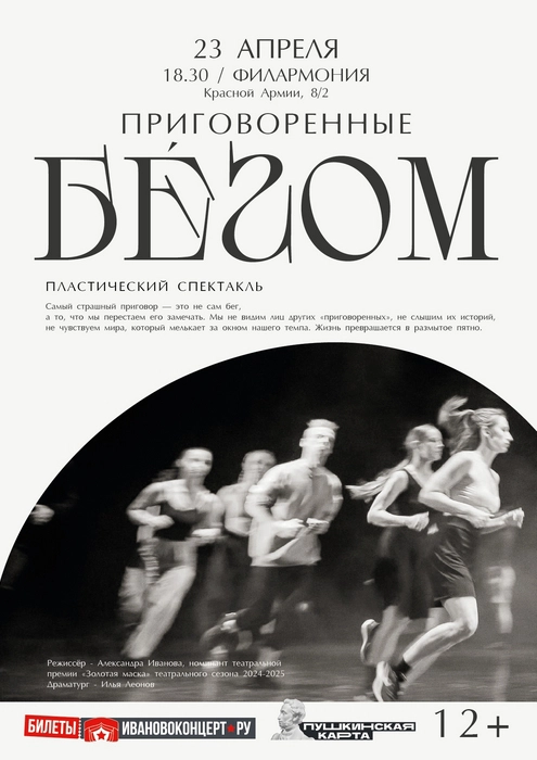 23 апреля в 18-30 Ивановская государственная филармония представляет пластический спектакль «Приговорённые бЕгом» - современное прочтение нашей жизни.