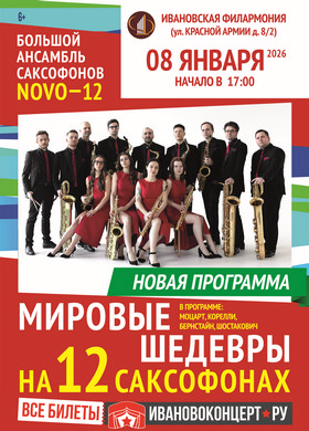 Мировые шедевры на 12 саксофонах (новая программа), 6+. Большой Ансамбль саксофонов «N O V O-12»