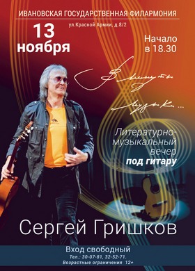 13 ноября в 18-30 Ивановская государственная филармония приглашает на литературно-музыкальный вечер под гитару. Сергей Гришков — профессиональный филолог, переводчик...