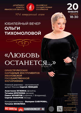 20 января в 18-30 Ивановская государственная филармония приглашает на юбилейный вечер Ольги Тихомоловой «Любовь останется…» Яркая певица с великолепным голосом и чув...