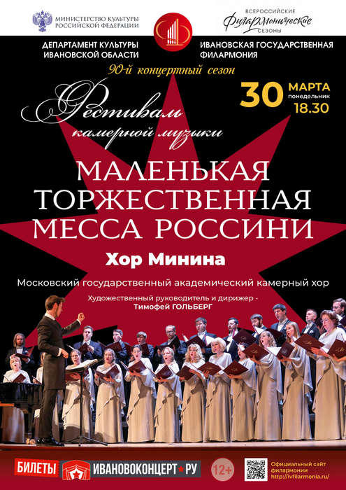 30 марта в 18-30 на сцене Ивановской государственной филармонии выступает Московский государственный академический камерный хор, известный во всем мире как Хор Минина, с программой «Маленькая торжественная месса» Д. Россини.