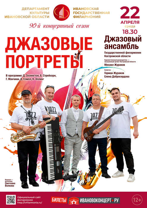 22 апреля в 18.30 приглашаем на концертную программу "Джазовые портреты", которую представит джазовый ансамбль Государственной филармонии Костромской области под управлением заслуженного артиста Костромской области Михаила Журакова.