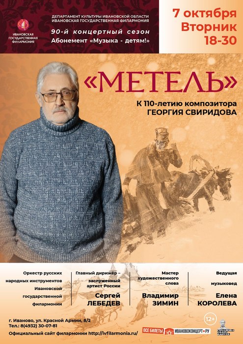 7 октября в 18:30 Ивановская филармония в рамках абонемента «Музыка – детям!» представляет юным слушателям литературно-музыкальную программу «Метель» — знаменитые музыкальные иллюстрации мастера, созданные по мотивам бессмертной повести А.С. Пушкина.