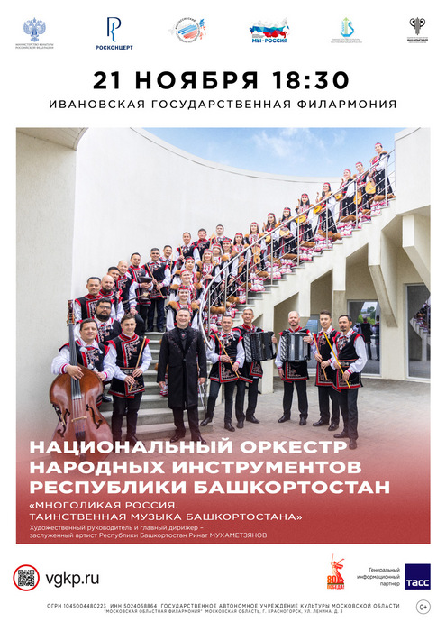 21 ноября в 18-30 Ивановская государственная филармония представляет уникальную программу «Многоликая Россия. Таинственная музыка Башкортостана» музыкального этнобренда Республики Башкортостан Национального оркестра народных инструментов РБ, художественный руководитель и главный дирижер – заслуженный артист РБ Ринат МУХАМЕТЗЯНОВ/