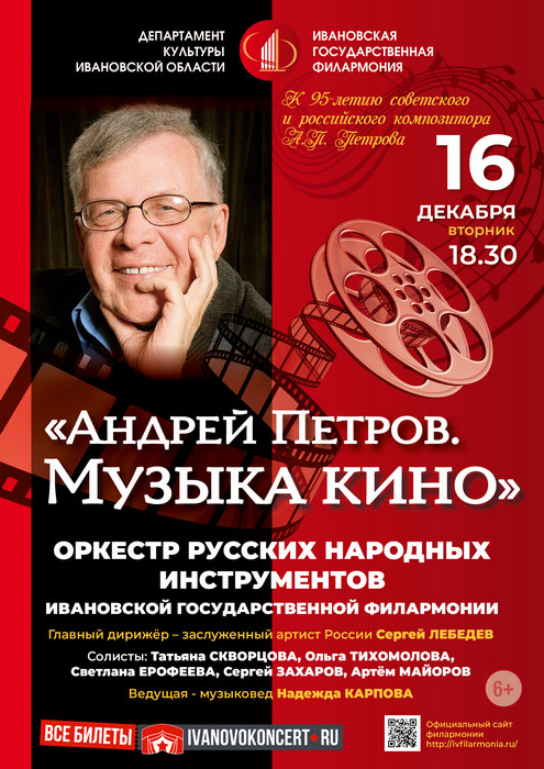 16 декабря в 18-30 Ивановская государственная филармония приглашает слушателей на концертную программу «Андрей Петров. Музыка кино», посвящённую 95-летию со дня рождения советского и российского композитора Андрея Петрова.
