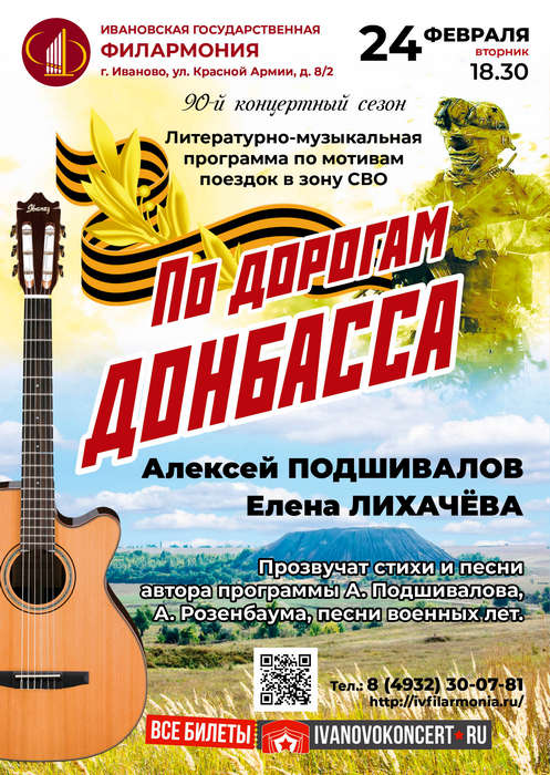 В годовщину специальной военной операции Ивановская филармония приглашает на музыкальную программу, пропитанную горячей любовью к своей Родине, повествующую о поездке артистов филармонии Алексея Подшивалова и Елены Лихачёвой в зону СВО.
