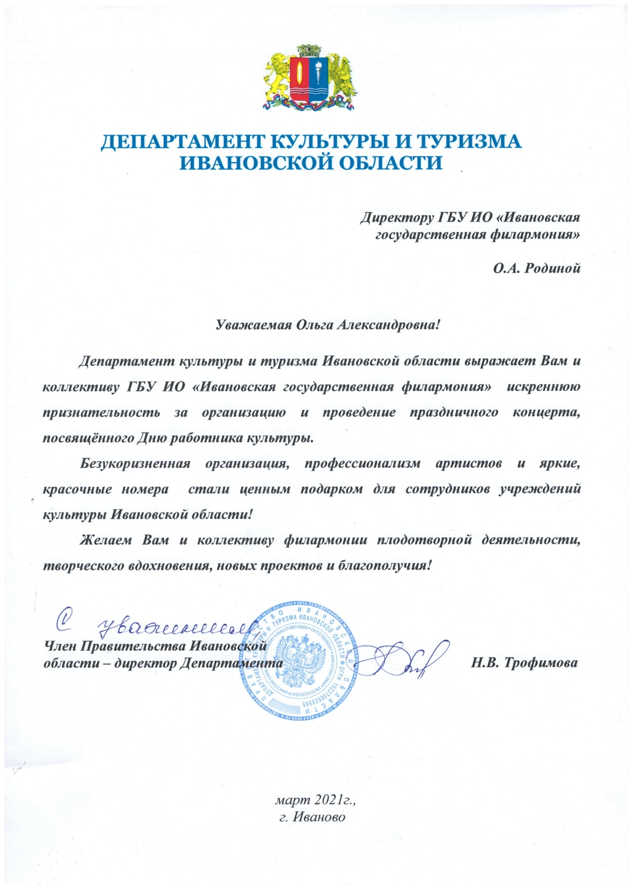 Благодарность директору О.А.Родиной и коллективу Ивановской филармонии