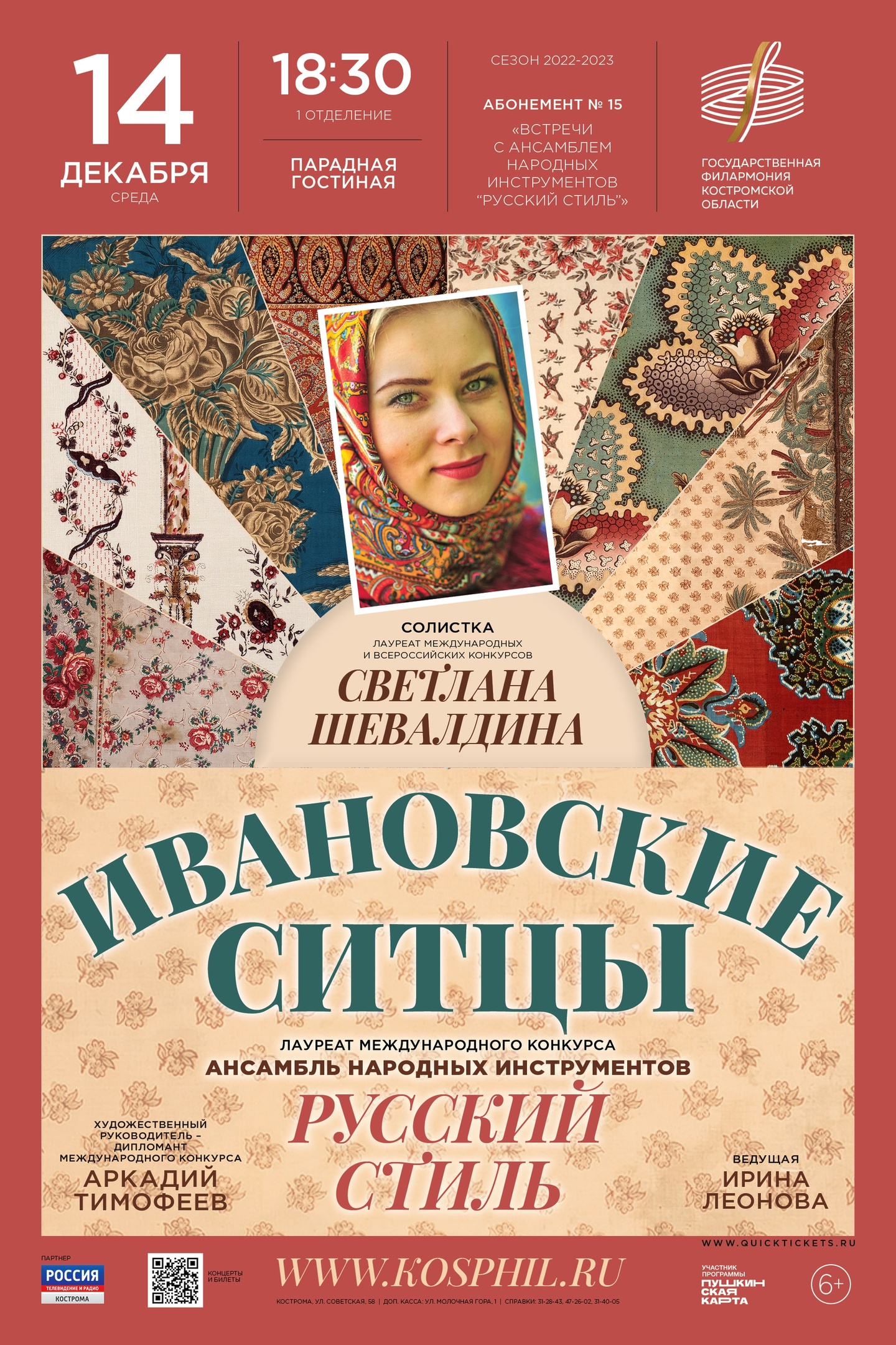 В рамках обменных гастролей 14 декабря на сцене Государственной филармонии Костромской области состоится программа "Ивановские ситцы" в исполнении солистки Ивановской филармонии Светланы Шевалдиной (Ерофеевой) и ансамбля русских народных инструментов "Русский стиль" Костромской филармонии, под управлением Аркадия Тимофеева. На сцене Ивановской филармонии программа будет представлена 9 февраля!
