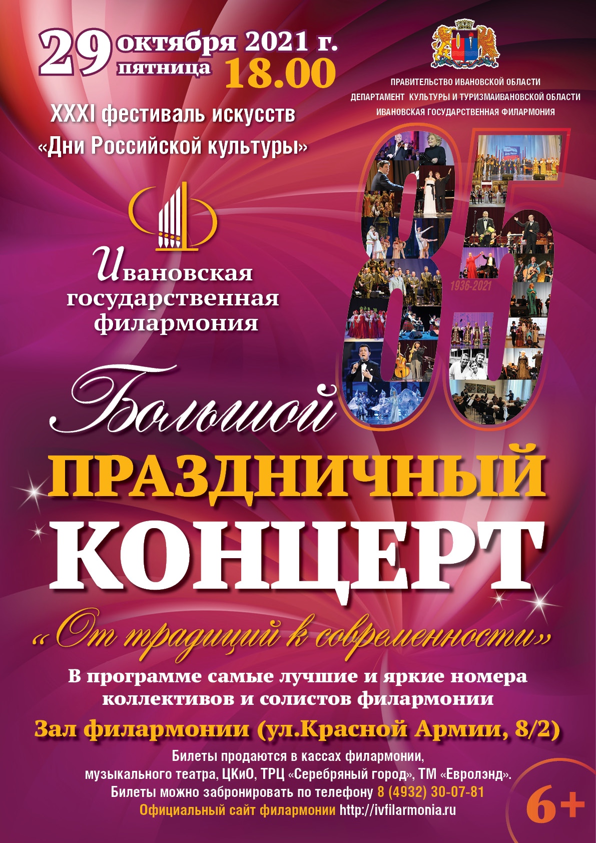 Уважаемые зрители! В связи с внесением изменений в Указ Губернатора Ивановской области от 19.10.21 г. юбилейный праздничный концерт филармонии "От традиций к современности", назначенный на 29 октября, переносится на более поздний срок. О дате сообщим дополнительно. Все приобретённые билеты будут действительны.