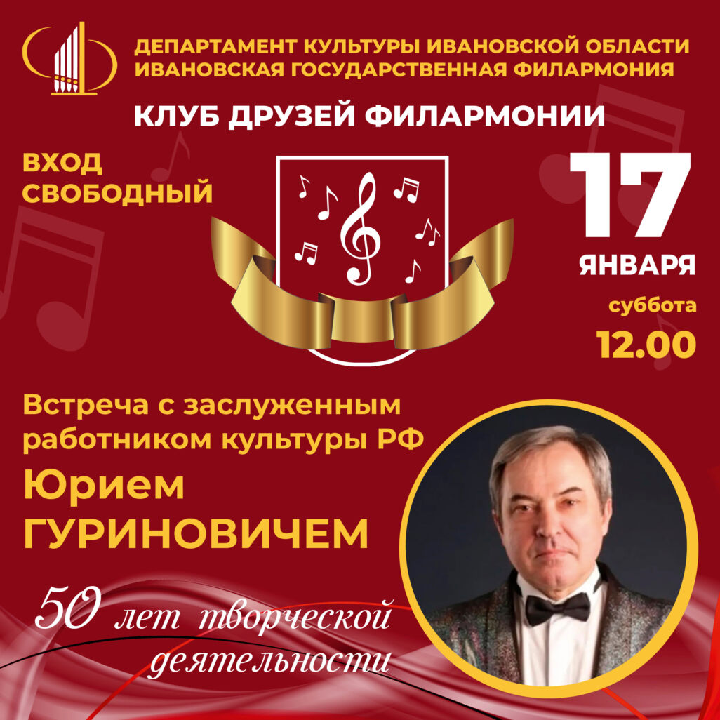Эту встречу мы посвятим чествованию выдающегося человека — Заслуженного работника культуры Юрия Гуриновича, который в этом году отмечает 50-летие своей творческой деятельности!