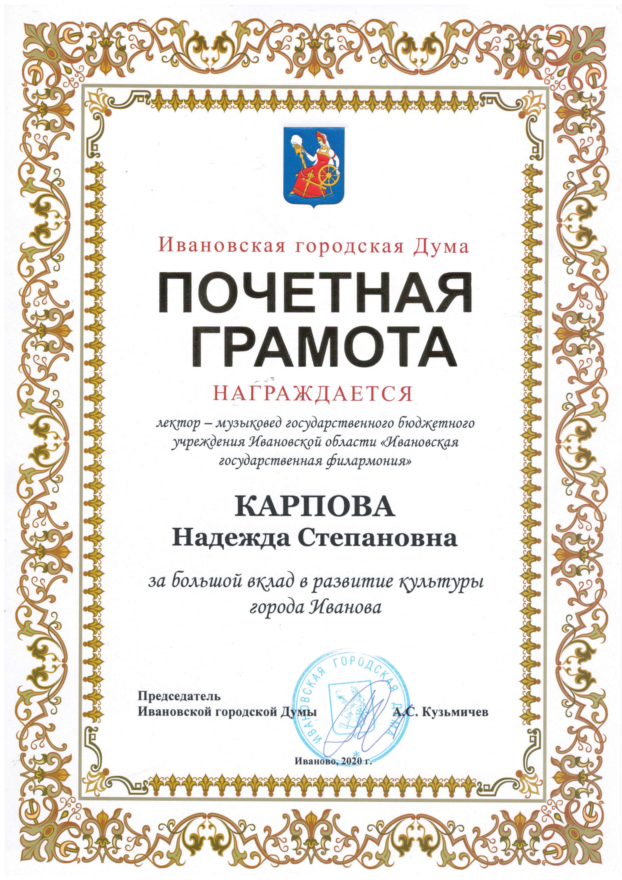 Поздравляем лектора - музыковеда Ивановской государственной филармонии Карпову Надежду Степановну с награждением Почетной грамотой Ивановской городской Думы за большой вклад в развитие культуры города Иванова!